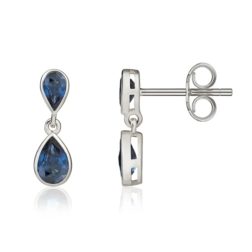 9CT White Gold Pear Shaped Blue Sapphire Double Stone Rubover Drop Earrings